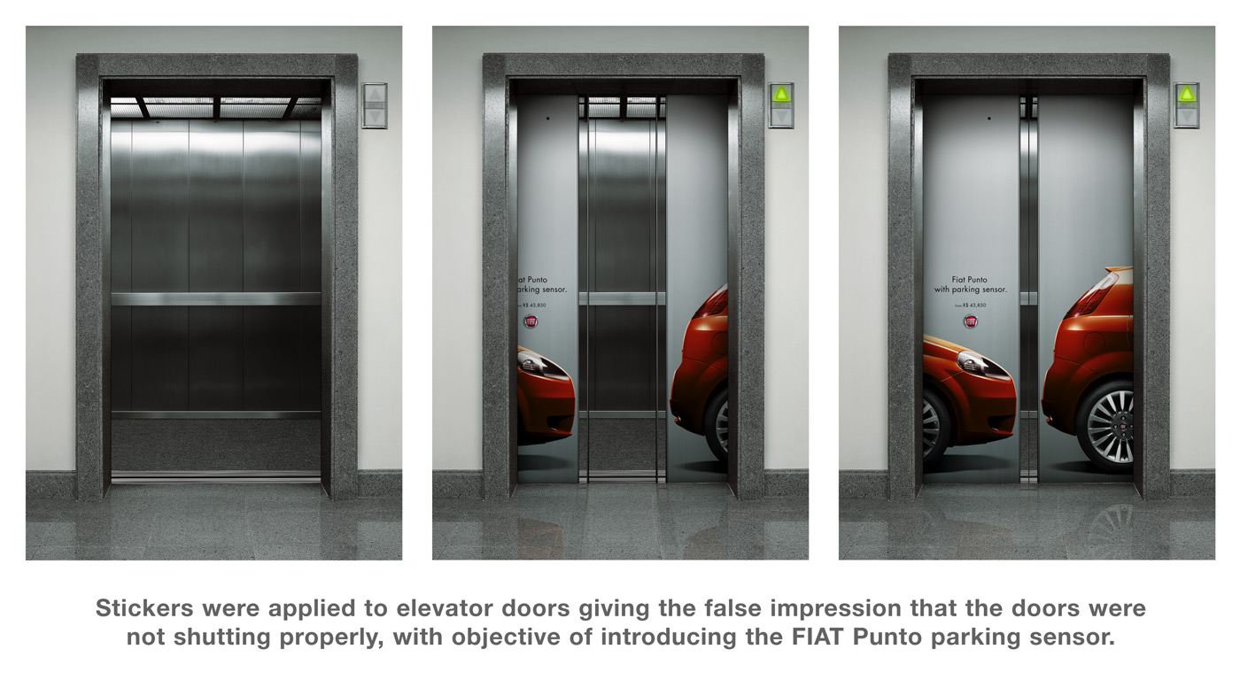 Stickers applied to elevator doors giving the impression that the doors were not shutting properly, with objective of introducing the Fiat Punto parking sensor. Creative!