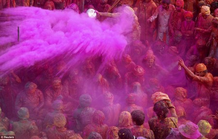 Culori de primavara: Barbati improscati in pulberi colorate celebreaza Lathmar Holi, cunoscuta drept festivaul culorilor, in satul Nandgaon langa orasul Indian Mathura.