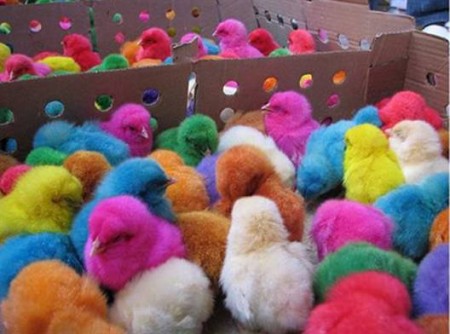 Puii astia sunt in toate culorile curcubeului. Traiesc intr-o ferma din Durango, si sunt vreo 900 in total. In fiecare an inainte de Paste, proprietarii fermei injecteaza ouale ce sunt puse la clocit folosind culori alimentare, iar cand puiutii eclozeaza sunt gata imbracati in puf colorat. Procesul nu le face nici cel mai mic rau, iar pe masura ce cresc se intorc la culorile lor normale.