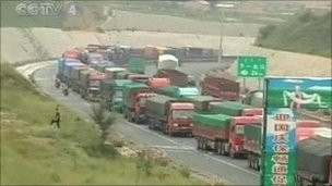 Vehicule, mai ales camioane incarcate plecate din Beijing, sunt intr-o coada lunga de aproximativ 100 km din cauza traficului greu, provocat de lucrarile la extinderea autostrazii. Soferii s-au plâns că localnicii i-au suprataxat pentru mancare si apa in timp ce ei stau blocati. Situatia se pregateste sa „revina la normal”, dupa cum a declarat televiziunea de stat luni.