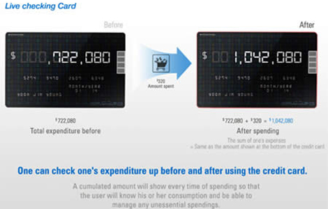 Stiti cine este Monstrul Verde? Este acea bucata de hartie ce vine la sfarsitul fiecarei luni; va mananca toti banutii pentru ca va depasiti … plapumioara! Daca ati putea vedea in timp real ce se intampla in bucatica aia de plastic! O carte de credit n-ar trebui sa va lase sa faceti astfel de extravagante. Dar nu orice carte, ci doar aceasta, realizata de Jin-young Yoon, Wook-sun Oh, Young-ho Lee & Jun-kyo Lee. Este un disply digital ce va permite sa verificati istoricul platilor in timp real. Va supravegheaza chiar si tranzactiile din contul bancar. O suma cumulata apare pe ecran de fiecare data cand atingeti cardul.