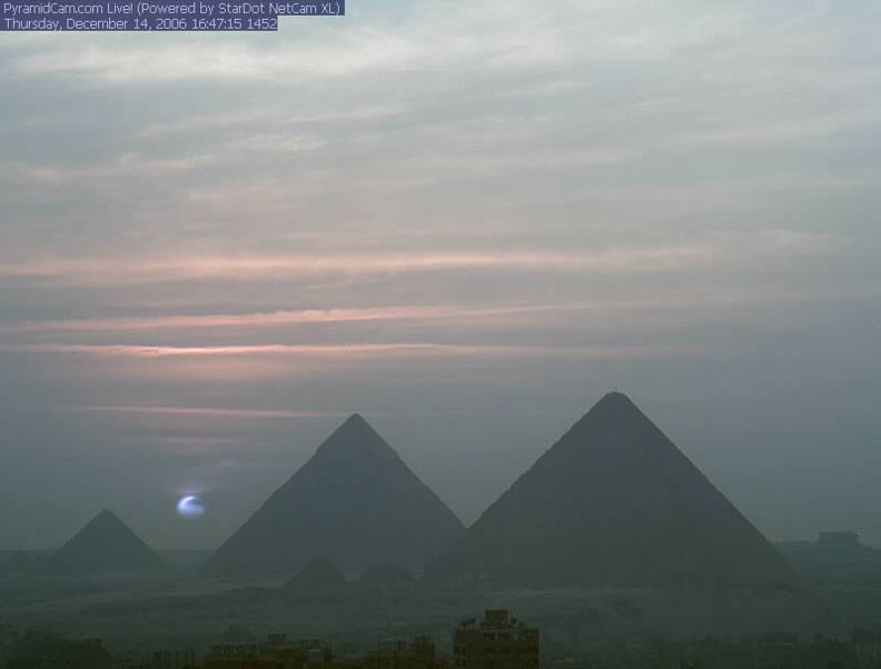 Un sistem de monitorizare PyramidCam a surprins o imagine live a piramidelor pentru 30 de secunde. Aceasta imagine in particular, salvata de Tom Hartlove pe 14 Decembrie 2006, este una din putinele ce exista cu soarele albastru. Fotografia a fost trimisa unui expert in fizica atmosferei ca sa afle ce ar fi putut cauza asta. Iata declaratia: „Un fenomen foarte rar cunoscut sub numele de „blue sun””. A mai fost observat din cand in cand si in alte locuri de pe planeta.