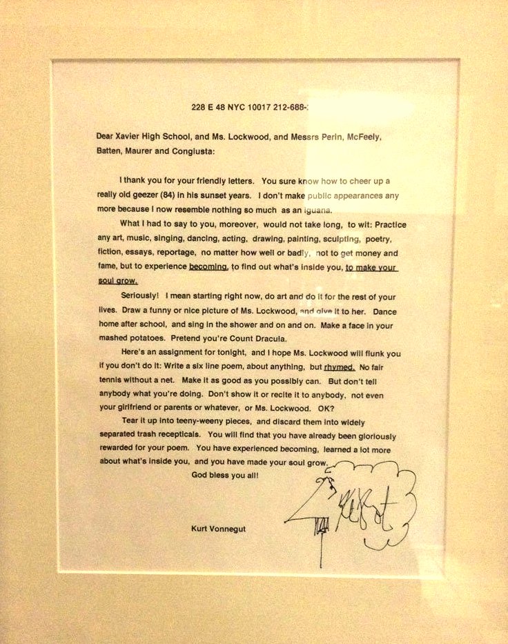In 2006 Ms.Lockwood, profesoara de limba engleza la Xavier High School, si-a rugat elevii sa scrie o scrisoare unui scriitor faimos, sa-l intrebe despre munca lui si sa-i ceara sfaturi. Ei si-au ales favoritul dar dintre toti carora copiii le-au scris unul singur le-a raspuns: acesta a fost Kurt Vonnegut (1922 – 2007). Raspunsul lui trebuie citit neaparat. Iar semnatura lui … Wow! Ce semnatura!