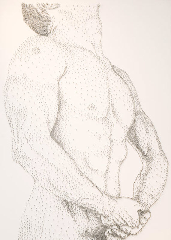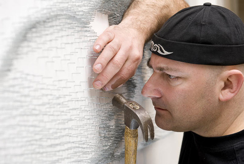 Artistul britanic Marcus Levine creeaza sculpturi folosind doar un ciocan si cuie … Foarte multe cuie. Unele sculpturi au nevoie de mai mult de 50.000 de cuie pentru a fi definitivate. De la distanta nu poti spune ca sunt sculpturi din cuie. Arata mai mult precum niste schite in creion. Dar cand privim cu mai multa atentie, cuiele iti sar imediat in ochi. Lucrarile sunt evaluate si li se fixeaza pretul in functie si de numarul de cuie folosite.