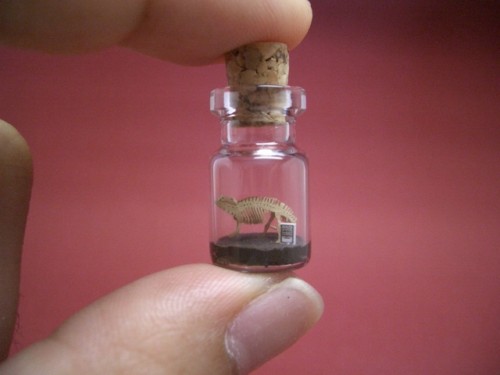 Creatorul de miniaturi Akinobu Izumi a realizat seria „A Tiny World In A Bottle”. Micuta lui lume la sticla este pur si simplu uluitoare. El are de toate, de la meduze la scheletele navelor … Sunt aranjate pe un strat de pamant si, ocazional, fixate in parafina lichida pentru a crea un efect plutitor. Daca va plac asigurati-va ca mai sunt disponibile, verificand magazinul lui online de pe Etsy, de unde le puteti cumpara.