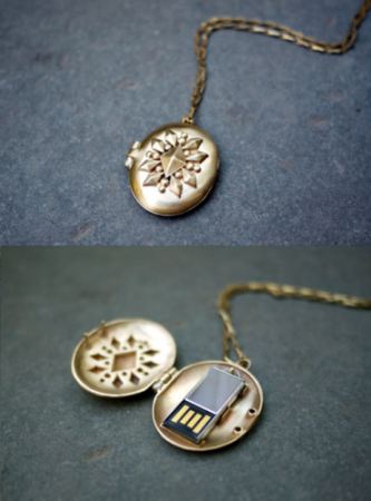 Emily Rothschild foloseste acest concept retro si il transforma intr-un produs al acestui secol punand in interiorul medalionului un USB. Ce mai urmeaza in viitor? Vom trai si vom vedea dar aceasta este o adaptare destul de ieftina in comparatie cu un fazer sau un Tardis nu? 😀 Ori poate ceva mai realist. Puteti avea o bijuterie functionala deosebita pentru 240$. (foto: dvice.com)